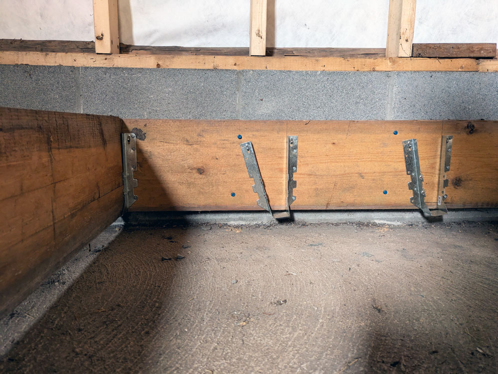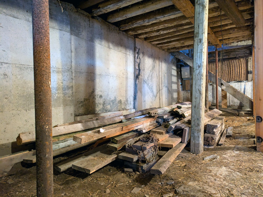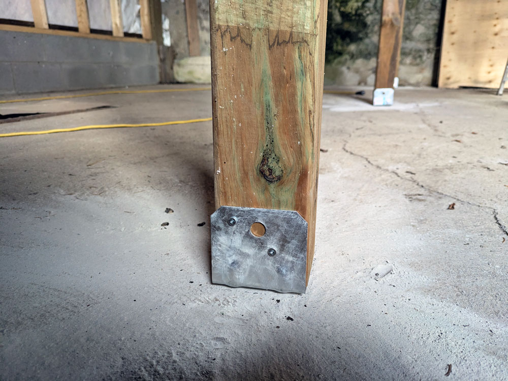 First step was setting three new posts. These support the floor, walls and ceiling. I drilled into the concrete floor, put in three saddles and then put up 4×4 posts that are screwed into the ceiling beam at the top.