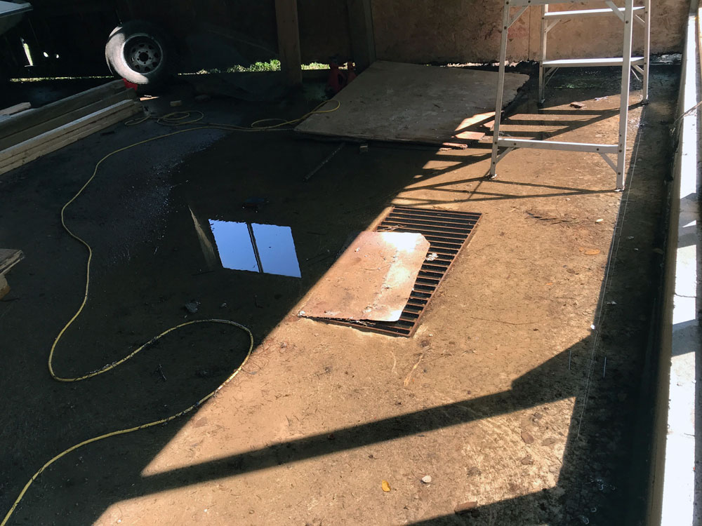 Then I could move onto the floor. I wanted a subfloor elevated above the existing concrete floor because this corner of the barn is sometimes a little wet. There’s a grate in the floor that appears to be connected to some kind of drain. But I have no idea where the drain goes and I suspect that it may be plugged, as every so often the grate overflows. We also a have a problem downspout and missing eavestroughs at the coop corner.