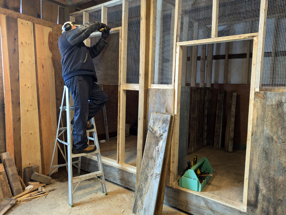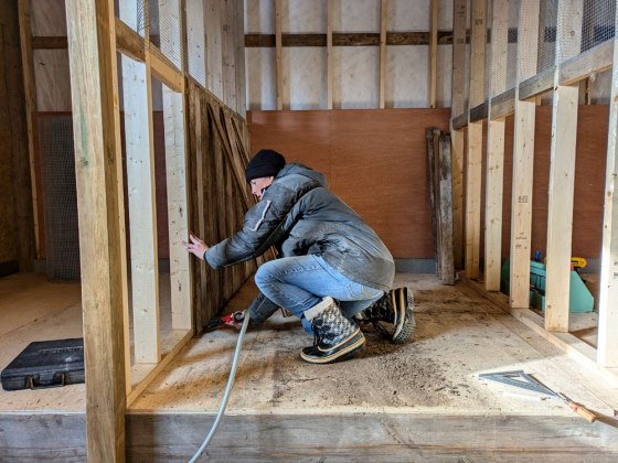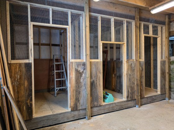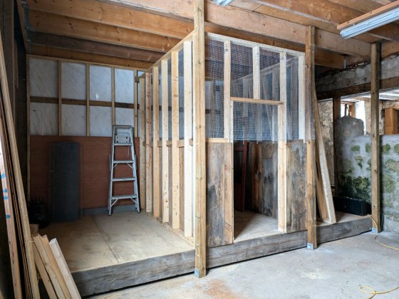 The interior walls between the pens were easy. Studs 16 inches on centre. Wood cladding on the bottom half (including some fancy tongue and groove salvaged from the old coop). Mesh on the top.