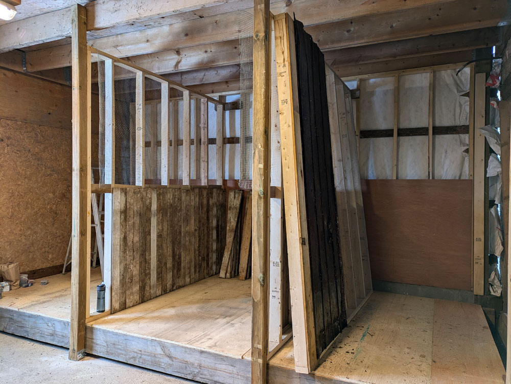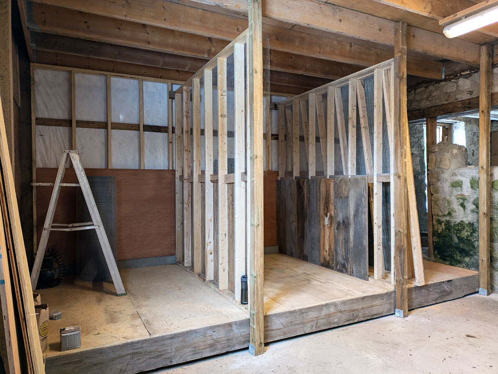 The chicken fit out took a little more work… and a relocation. The hens needed a few more things in their stall. Water and food, of course. But also nesting boxes and roosts. As I was planning the roosts, I realized everything wasn’t going to fit in the centre stall, which I had assigned to the chicks. But the end stall was a few inches bigger… just big enough for everything they needed. So they moved next door.