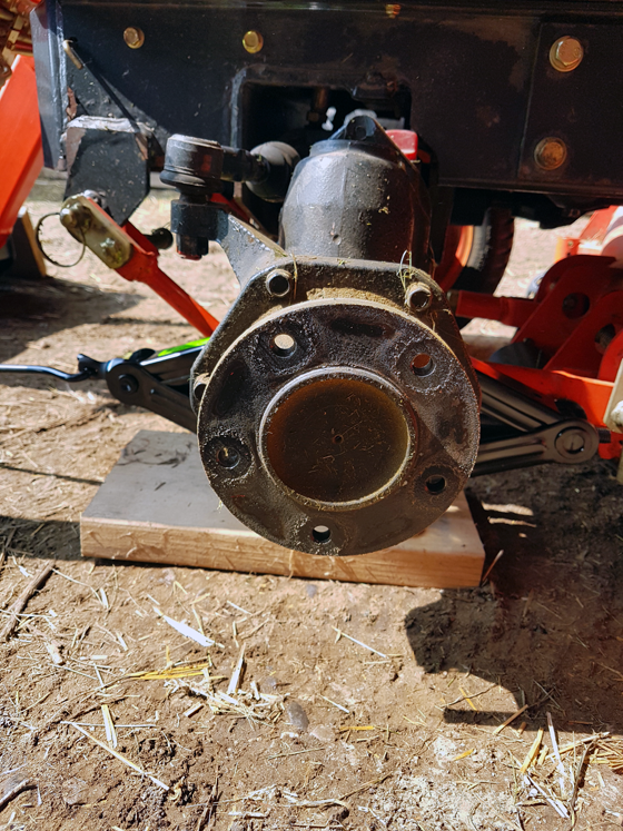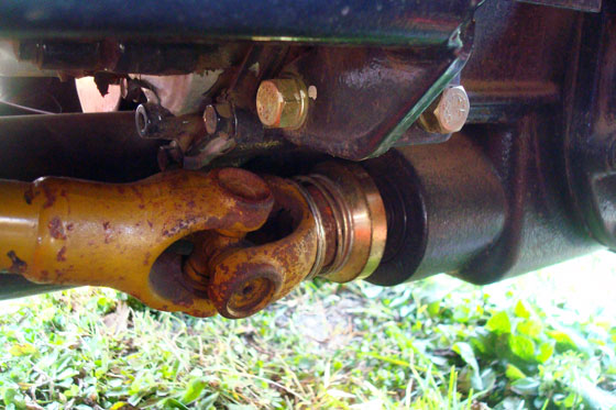 4. Disconnect the PTO. Push the shiny gold collar towards the mower deck (forwards), and pull it off the shaft. The person with the longest arms should do this (i.e. Matt), as the PTO is right in the middle under the tractor, and you have to reach over the deck and around the back wheel to reach it.