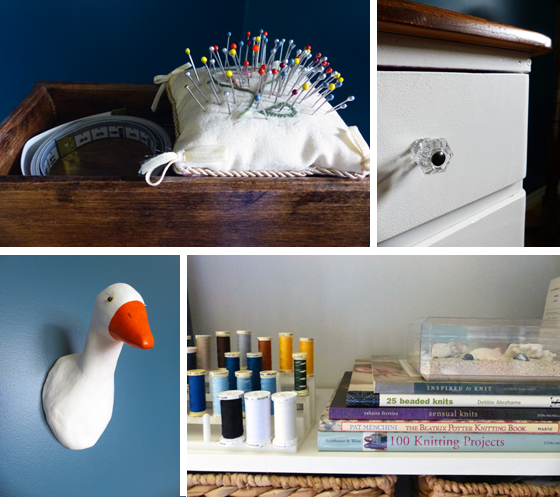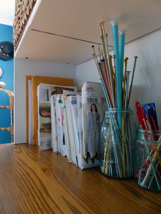 This wall used to be filled with boxes that had been packed since we moved in five years ago. Now, the thrifted china cabinet holds sewing and knitting supplies, magazines and memorabilia–and keeps them all organized.