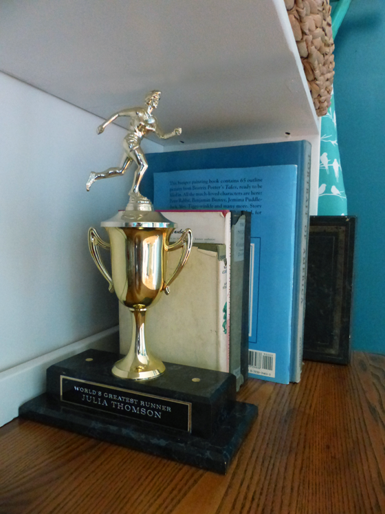 Growing up, I never won a trophy. When we were dating, I mentioned this to Matt. One fall, after I ran my first 10K, Matt presented me with a huge trophy. It meant so much to me that he did that. However, the trophy was truly huge. I took it apart and then put it back together in a slightly smaller configuration, and it fits easily on the shelves.