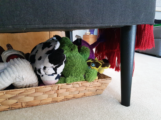 Baxter’s toys live in a basket under Austin–the basement is fun for everyone.