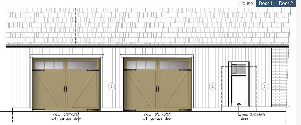I can get the carriage door look (hinges and handles) in a pressed door. In this profile, the design is pressed into the steel and there are no applied pieces. However, the profiles that I like the best (the two-panel or Zed above) are not available. I’d go with a simple shaker style panel to get as close as possible.