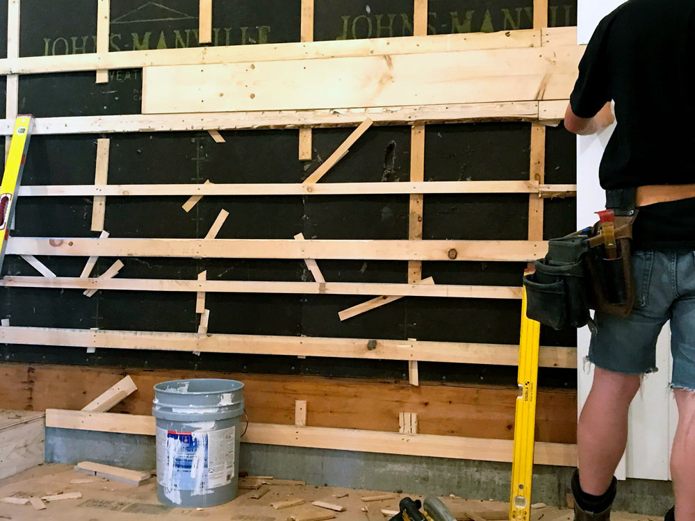 I prepped for the panelling by installing blocking between all the studs about halfway between the ceiling and the floor. This gave me an extra spot to nail the boards and ensure they were fastened securely. I used my Dad’s long level to make sure each board was straight and a rubber mallet to make sure the joints were tight. Then I face nailed each board top and bottom and one nail through the tongue into the blocking.