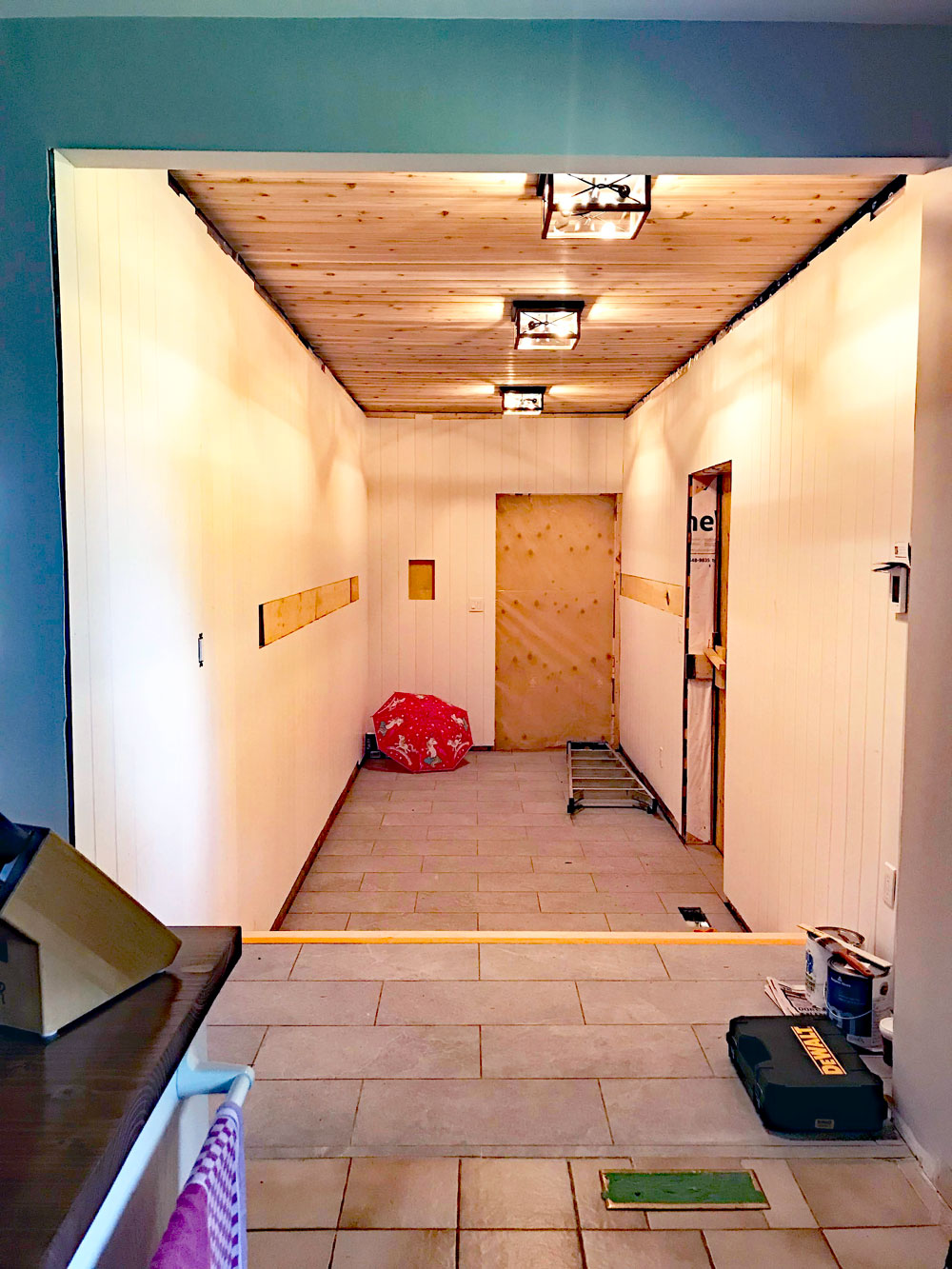The walls are the V-groove panelling, which I also love. It adds so much character to this room. My contractors did not love the panelling so much. Strapping the walls so that they were perfectly level took a lot of shims and a lot of time. (The new walls that they built were fine. The original wall backing onto the living room was c-r-o-o-k-e-d.)