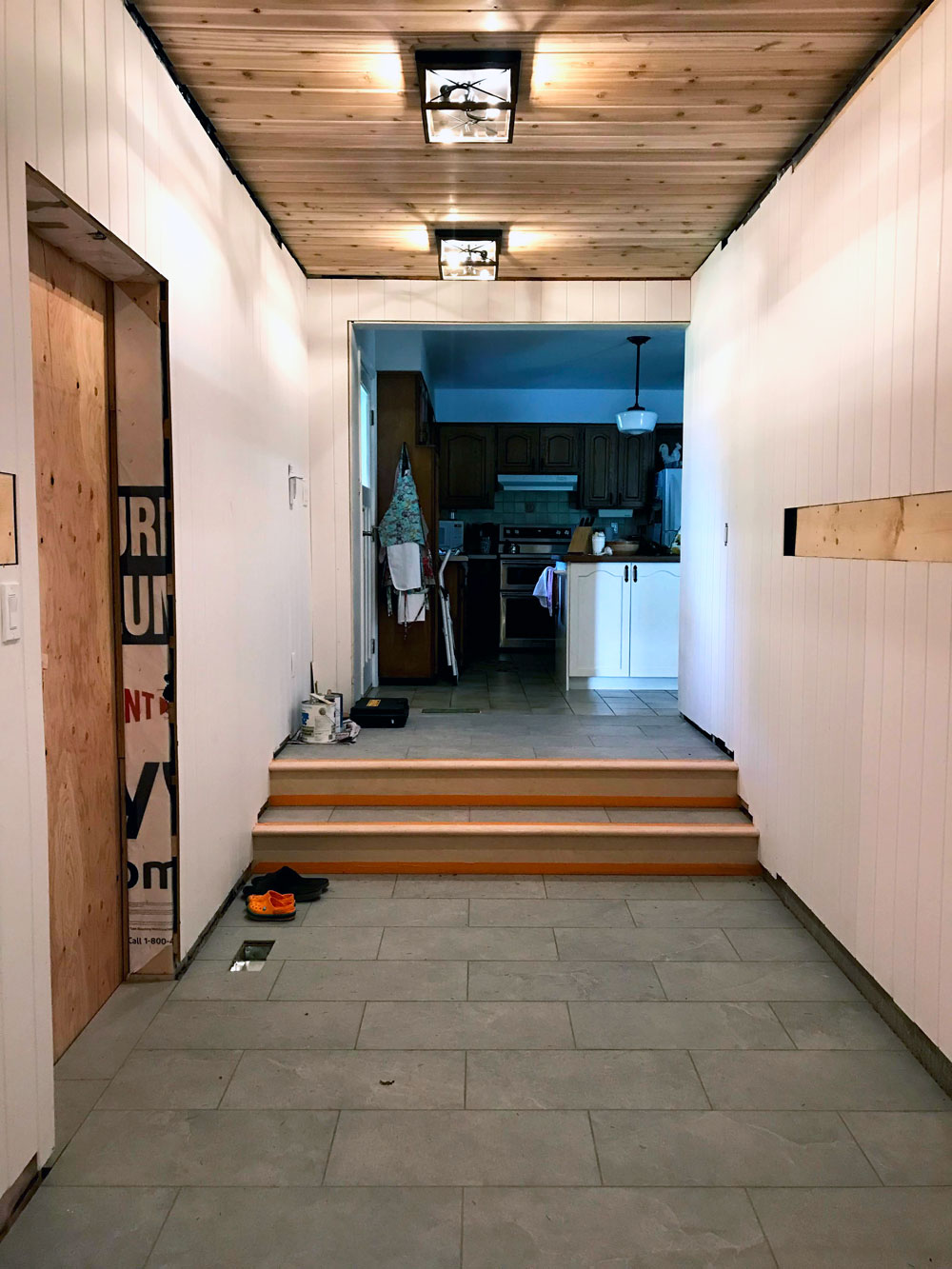 My last update took you through demo, plumbing and electrical rough-in, tile and the start of the wall panelling.
