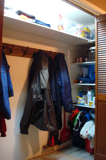 I screwed it in place, attached the hooks and felt completely validated in my new decorating philosophy. My enthusiasm was so great that despite its dampness I started grabbing coats and hanging them up.