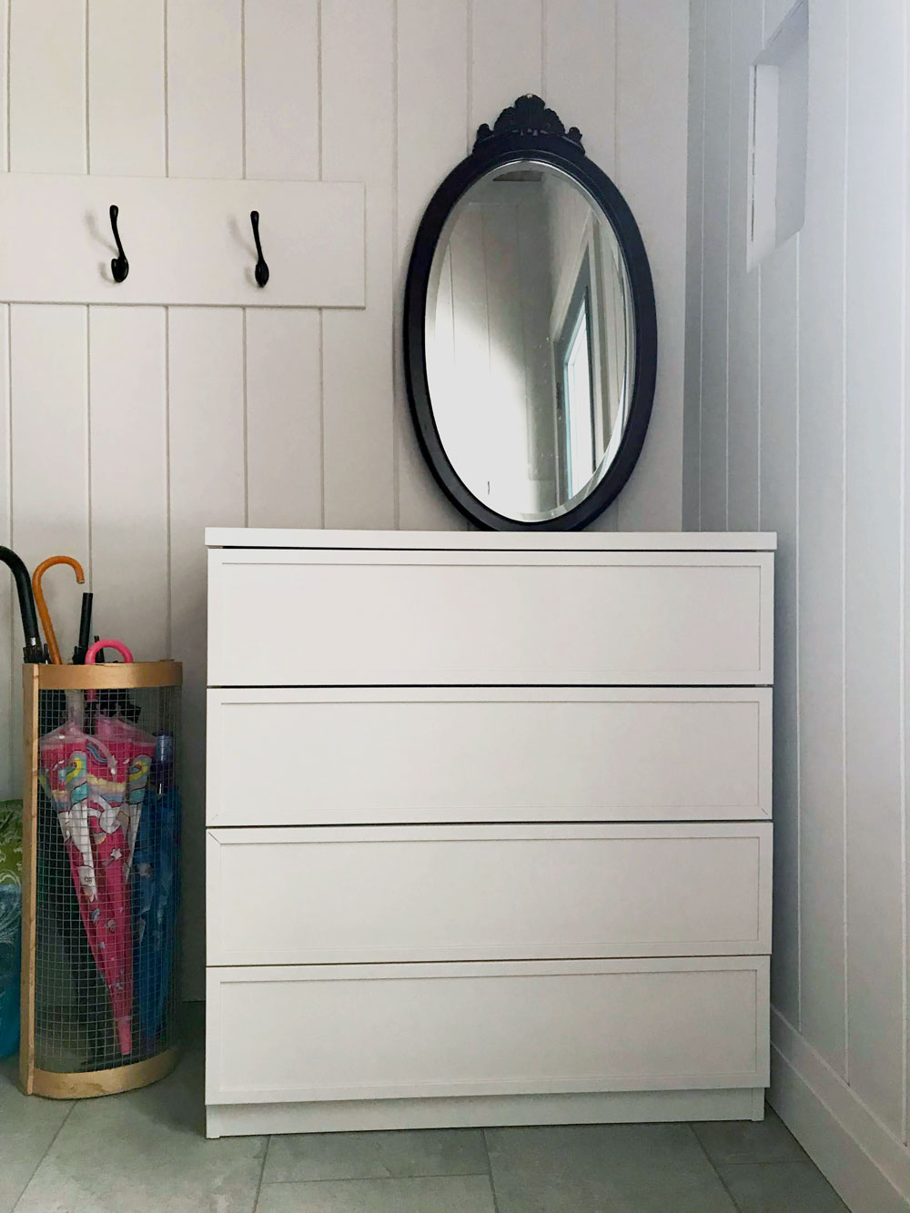 Someday the mudroom may have beautiful built-ins. But for now, we’re making it work with free hand-me-down dressers, our homemade bench and other DIYs. And honestly, they’re working great.