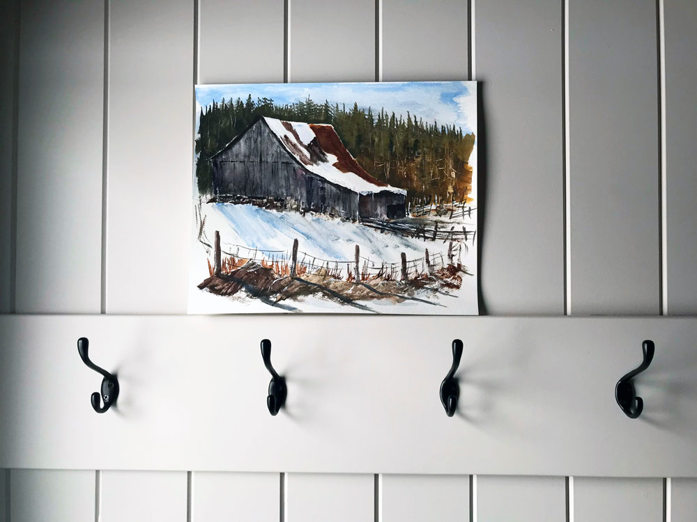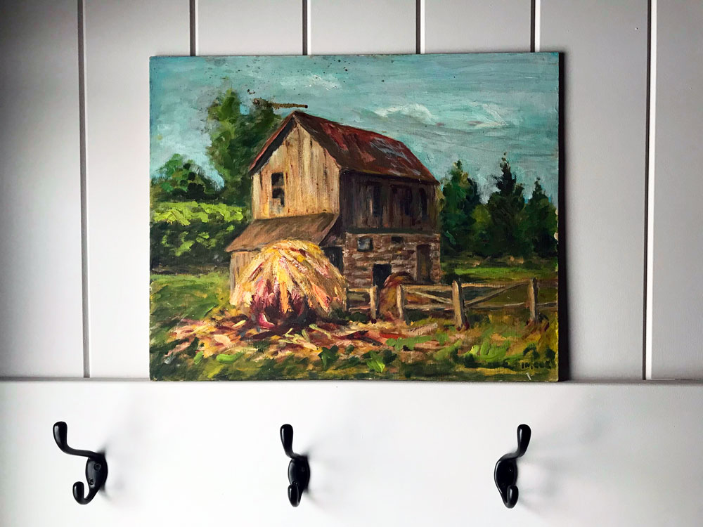 The painting on the wall is another special, personal touch. Like so much of the art in our house, this too was painted by Matt’s grandpa. When I shared art options for the mudroom a long-time reader had a brilliant suggestion: switch between paintings. So I had two framed. One summer scene (by Matt’s grandpa) and one winter (by my Mom’s friend). They’re roughly the same size, so they can hang on the same hook.