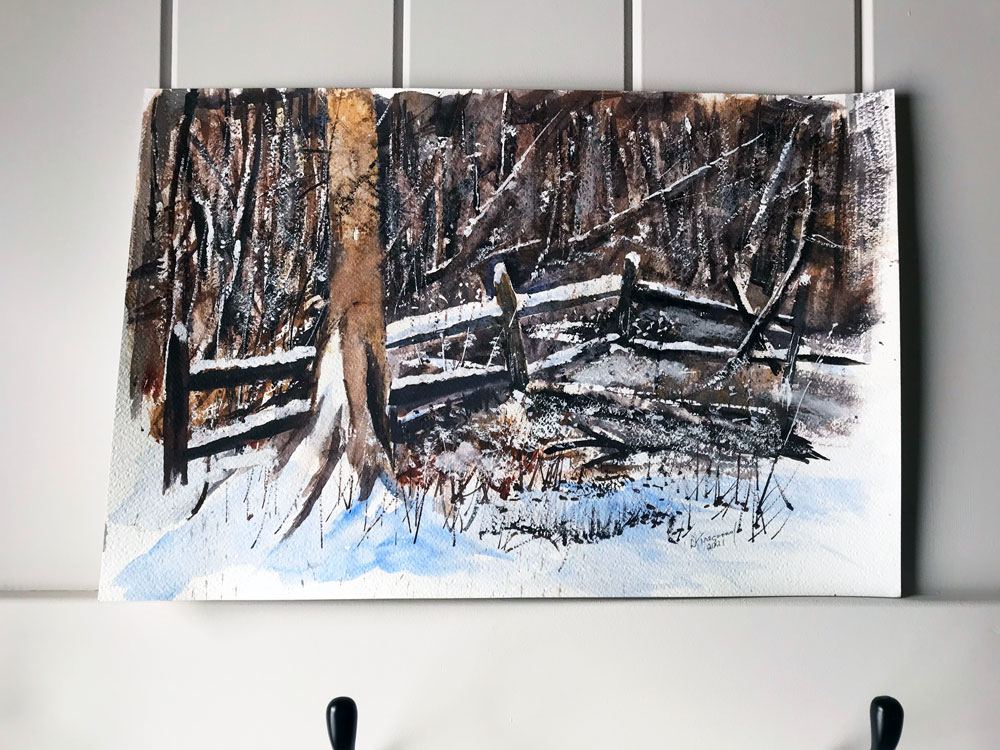 We don’t have a lot of wall space for pictures (and I don’t want to put too many holes in the paneling). I’m planning on hanging one painting. Matt’s Mom and my Mom have both sourced art for me. Matt’s Mom gave us a painting by Matt’s Grandpa. My Mom’s friend gave her two water colours that he painted. They’re all great farm scenes, and I really like how the blue and green tones contrast with the beige paneling. (Note that despite the photo differences below they’re all close to the same size.) Which would you pick?