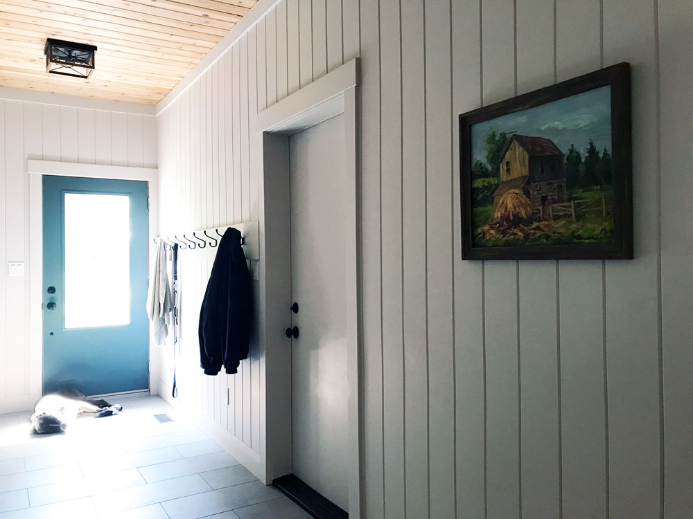 We live on a farm, but we don’t have a farmhouse. With every tweak we make, I try to inject more country character. The V-groove paneling on the walls, cedar on the ceiling and simple black hooks are all examples of that.