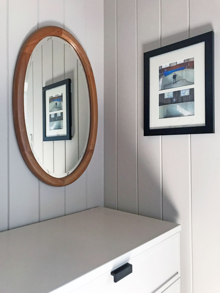 I found a big oval mirror at a thrift store this fall. The rounded shape will be a nice contrast to all the straight lines in the room. I’m going to remove the decorative piece on the top and refinish the wood frame, aiming for a rustic finish that will go with our cedar ceiling.