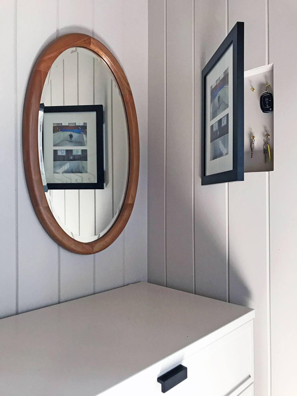 During construction I had our contractors insert a little wood box that I made into the wall beside the door. This box is going to become a hidden key cupboard. A few rows of cup hooks will give us plenty of space to hang keys. For the cupboard door, I’m going to use a picture attached to hinges. Storage. ✓ Art. ✓ Function. ✓ Form. ✓