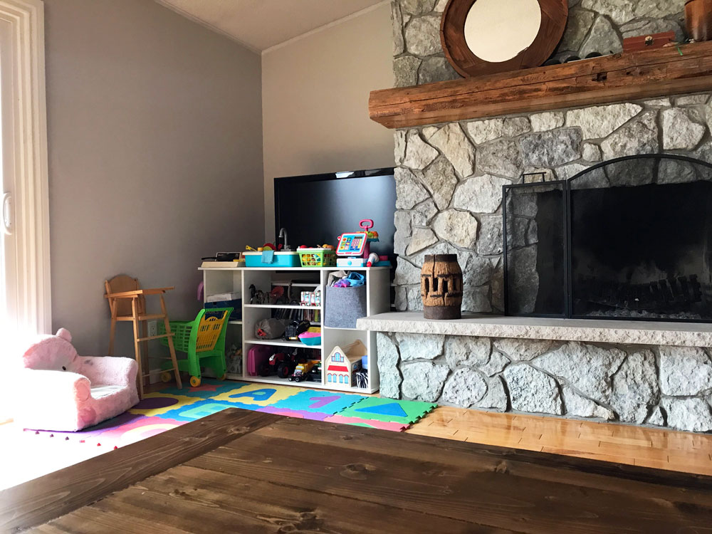I also realized the toys are used much more often than the TV. So I decided to tuck the TV away. I pushed it back into the corner and made a play zone in front of it.