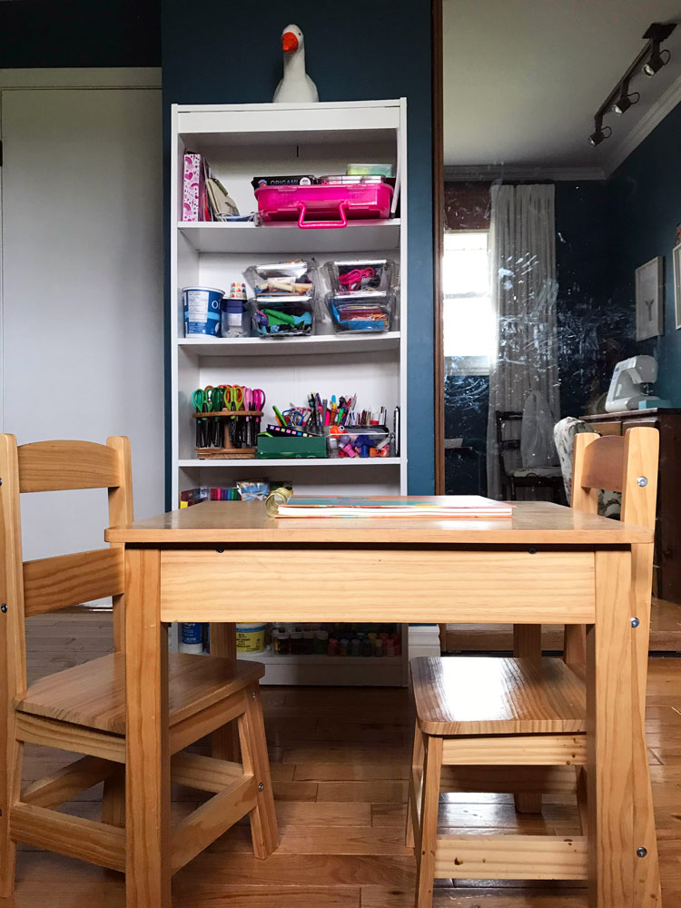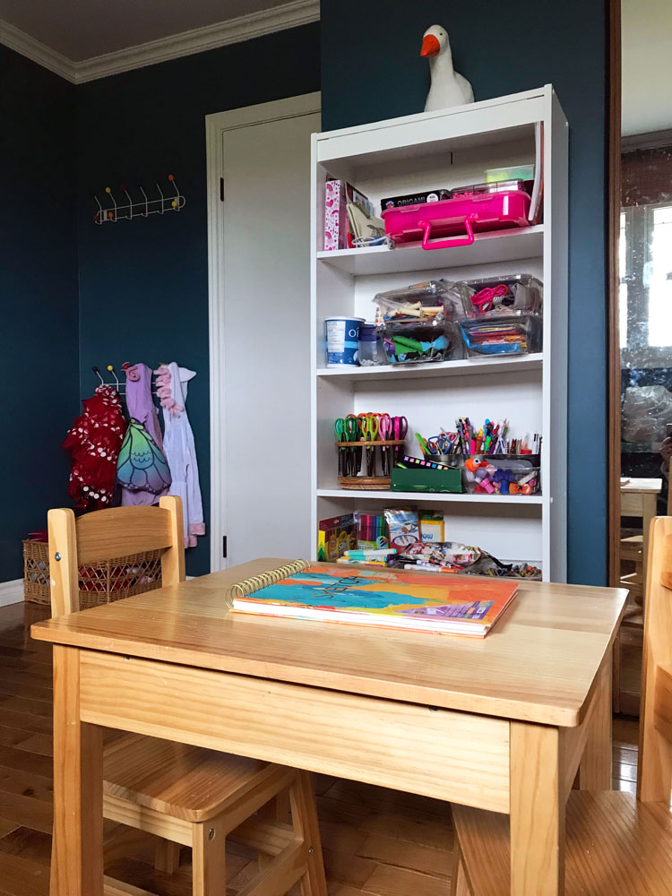 The coffee table still gets covered regularly with crafts and colouring, but now there’s usually a spot to set down our afternoon snack or a book. Progress.