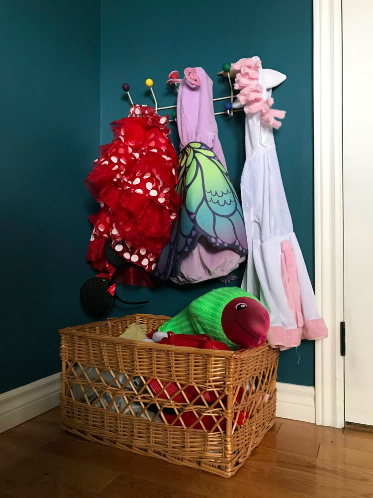 Her little table and chairs moved from the living room to the new (soon-to-be) playroom. I also used my knock-off DIY Eames hang-it-all to arrange a little dress-up area for her with all of her costumes and a bin for accessories such as hats, crowns, scarves, Minnie Mouse hands, or an inflated pink dolphin wearing a fluourescent green legwarmer (???).
