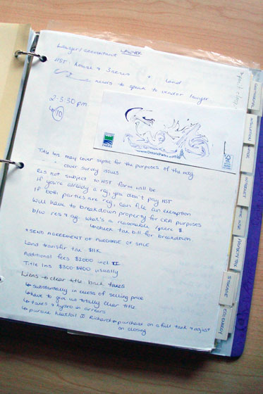 Here’s the first page in my “lawyer” section. I have everything from appointment times, notes on title insurance and land transfer tax, even the scrap of paper where my dad first wrote down the lawyer’s contact information (which I’ve blurred out) stapled onto the page.