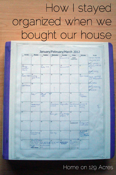 There are lots of things to remember when buying and selling a house. A calendar or schedule is essential to keep things on track. I made a customized calendar that showed the two months from when we purchased the farm to after we moved in all on one page. The front cover of my binder had a plastic sleeve, so I slipped the calendar in there, where I could always see it at a glance.