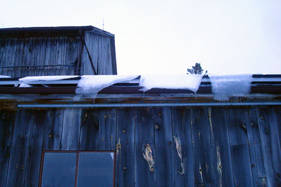 Eventually, with some yoga-like contortions and gentle shovel work from Matt, combined with the help of–what else?–the sun, the drift slid down the panels and off the roof in big icy sheets.